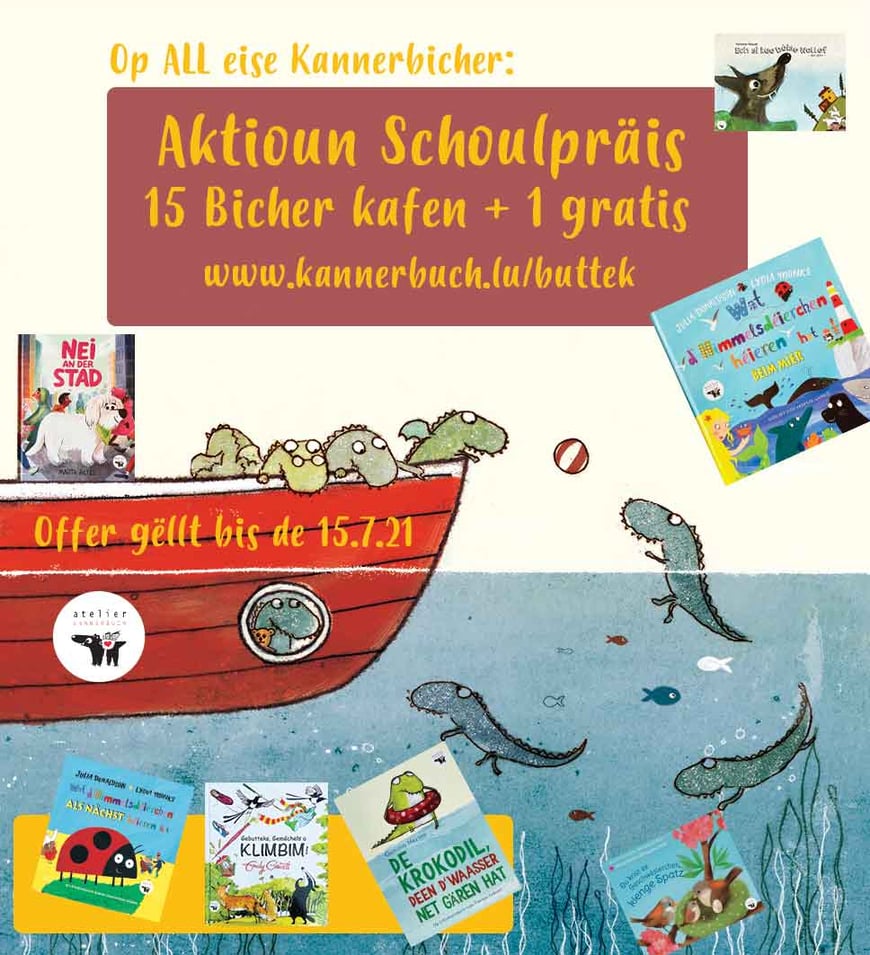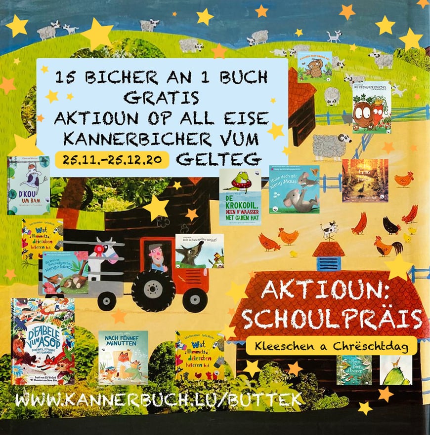 Ab dem 24.04.25 start nees eis AKTIOUN SCHOULPRäIS bis den 10.07.25 (nach mat).Dir bestellt min. 10 Kannerbucher iwwert Email info@kannerbuch.lu oder Online Shop www.kannerbuch.lu/buttek a kënnt Iech zousätzlech 1 Buch raussichen, dat mer Iech als Kaddo schenken. Schréift eis weg wéieen dass der gären als Kaddo wëllt dobäi kréien.Dës Offer gëllt fir Bestellungen direkt bei eis.
